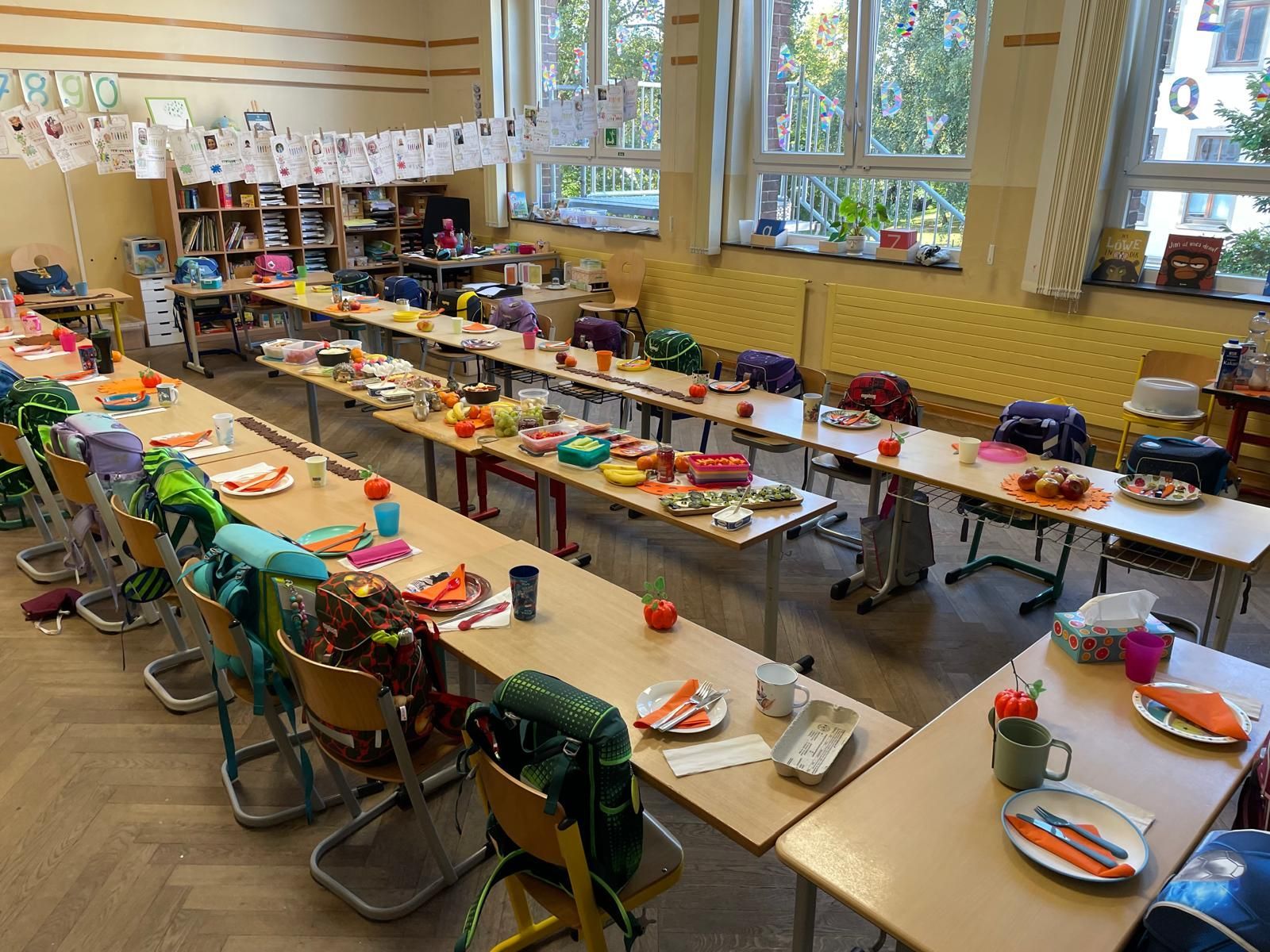 Am letzten Schultag vor den Ferien haben wir Erntedank gefeiert. Erst waren wir mit der gesamten Schule in der Kirche. Im Anschluss haben wir in den Klassen gemeinsam gefrühstückt. In vielen Klassen haben die Eltern toll geschmückt und die Kinder und die Lehrkräfte wurden nach der Kirche mit einem wunderschön gestalteten Raum überrascht.